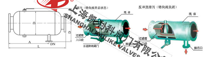 手動(dòng)蝶閥關(guān)閉,即閥板平面與筒體軸線垂直,(此時(shí)扳手旋轉(zhuǎn)90度與筒體軸線垂直),開啟排污閥,此時(shí)水流從進(jìn)口進(jìn)入過濾網(wǎng)筒前端,因蝶閥關(guān)閉,水流被閥板擋住,只能從前端網(wǎng)孔進(jìn)入濾筒外側(cè),大部分從出口流出,而由于排污口打開,濾筒后段水排出后壓力降低,故一部分水又從過濾器后段的網(wǎng)孔反沖入網(wǎng)筒內(nèi),從而達(dá)到從濾網(wǎng)外部沖洗粘附在網(wǎng)