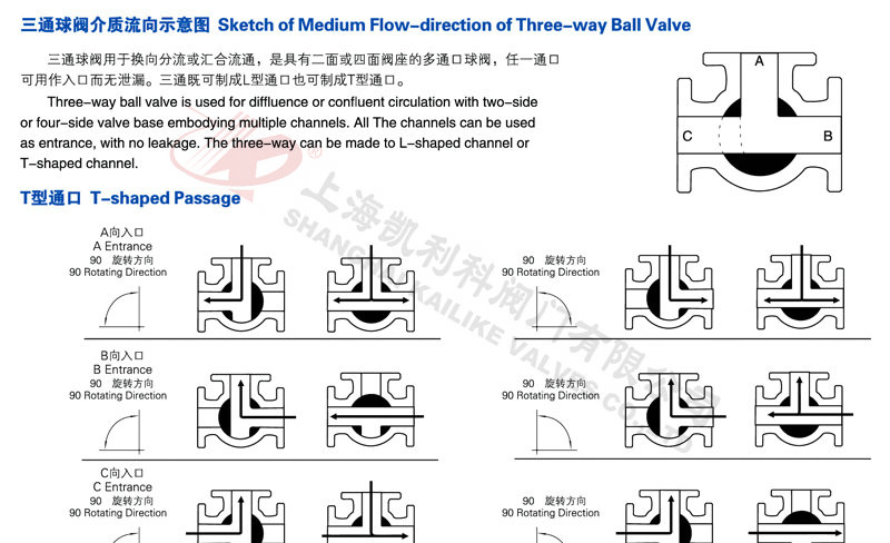 氣動三通球閥分L型和T型,介質流通方向見下圖。L型氣動三通球閥適用于介質流向的切換,能使相互垂直的兩個通道連通:T型氣動三通球閥適用于介質的分流、合流或流向 切換,T型孔道可以使三個通道互相連通或使其中兩個通道連通,氣動三通球閥一般采用三個閥座結構,亦可根據(jù)用戶要求采用四閥座結構。