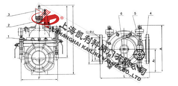 當閥門從進口端給水時,水流過針閥進入主閥控制室,并經過導閥、球閥流出主閥控制室到出口,此時主閥處于全開或浮動狀態。調定主閥上部的流量調節閥,可為主閥設定一定開度。調節針閥開度和調節導閥彈簧壓力,即可使主閥開度保持在設定開度,并在壓力變化時導閥進行自動調節,保持流量不變。